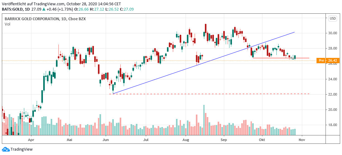 Die Aktie von Barrick Gold bewegt sich im Vergleich dazu zwar deutlich geringer. Gleichwohl ist auch bei Barrick bereits seit einigen Wochen der ab Juni 2020 gebildete Aufwärtstrend gebrochen. Danach ist die Aktie mustergültig an diesem von unten abgeprallt. Ob die Aktie vom aktuellen Niveau aus einen neuen Aufwärtsimpuls erhält oder erst deutlich tiefer, wollen wir nicht abwarten und nutzen deshalb die aktuelle Unsicherheit zum Liquiditätsaufbau.