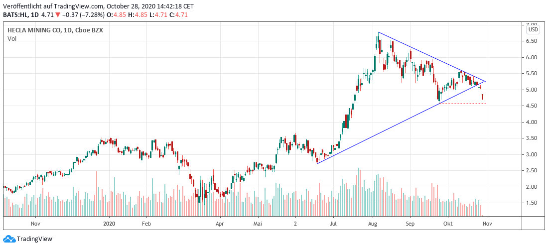 Gleiches gilt für die Aktie von Hecla Mining, die ebenfalls unter ihren Konsolidierungskeil gefallen ist. Dies deutet auf kurzfristiges Abwärtspotenzial hin.