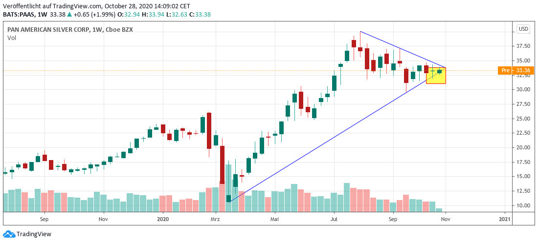 Der Chart von Pan American Silver zeigt, dass die Aktie aus ihrem Konsolidierungskeil nach unten herausgefallen ist und damit ein technisches Verkaufssignal gegeben hat.