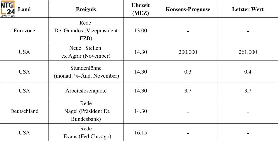 Gleichzeitig wird auch ein Rückgang des monatlichen Stundenlohn-Anstiegs von 0,4 % auf 0,3 % erwartet. Die Arbeitslosenquote sollte unverändert bei 3,7 % verharren. Unsere Einschätzung ist, sollten die neubesetzten Stellen und der Stundenlohn-Anstieg höher als erwartet ausfallen, dass dies die Kurse von Gold und den anderen Edelmetallen - gerade nach ihren Rallyes seit Anfang November - negativ beeinflussen wird.