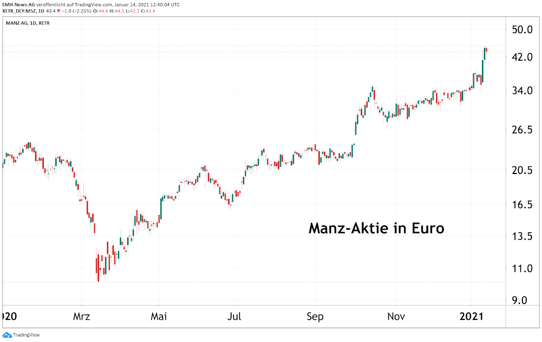 Der süddeutsche Hightech-Maschinenbauer Manz (ISIN: DE000A0JQ5U3; WKN: A0JQ5) wird trotz eines starken Kursanstiegs seit März 2020 bislang kaum von Investoren beachtet. Dies dürfte sich aber kurz- mittelfristig ändern, da der Konzern derzeit immer stärker auf das Feld der Elektromobilität setzt. Neben der Herstellung von Maschinen zur Herstellung von Batterien zogen die Reutlinger im November 2020 und auch in diesem Januar zwei größere Orders für Montagelinien im Bereich der Elektromobilität an Land.