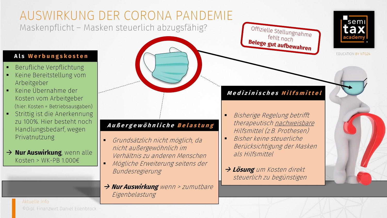 Mittlerweile dauert die Corona-Pandemie schon weit mehr als ein halbes Jahr an und die Maskenpflicht kann z.B. bei Familien schnell einen dreistelligen Kostenfaktor auslösen. Viele fragen sich daher zurecht, ob man diese Kosten hierfür von den Steuern absetzen kann. Mit diesem Artikel möchte ich Ihnen Möglichkeiten aufzeigen. Eine offizielle Stellungnahme der Länder gibt es leider noch nicht, aber sie wird in absehbarer Zeit erwartet. Es ist aber bereits im Vorfeld wichtig, einige Dinge zu beachten.