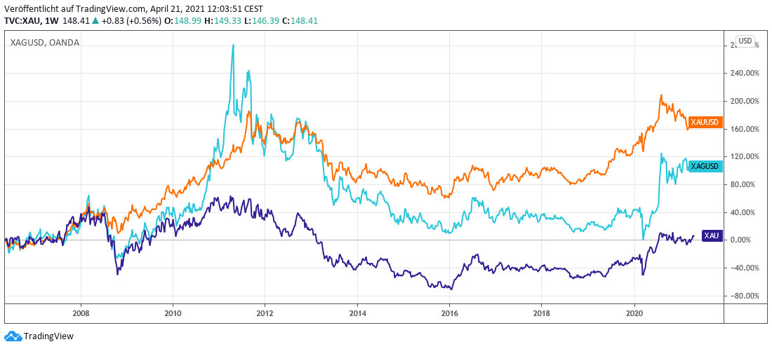 Silber hingegen hat nach einer Bärenfalle im Corona-Crash 2020 einen ,,Slingshot Move‘‘ hingelegt und mit einem ungefähr doppelt so starken Anstieg wie Gold seine Underperformance gegenüber dem gelben Metall deutlich verringert.