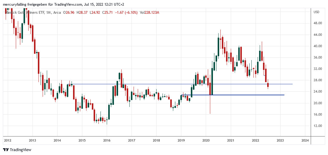 Ein Blick auf den VanEck Vectors Gold Miners ETF (IE00BQQP9F84), der den der den NYSE Arca Gold Miners-Index nachbildet, zeigt, dass es die Minenaktien derzeit schwer haben.