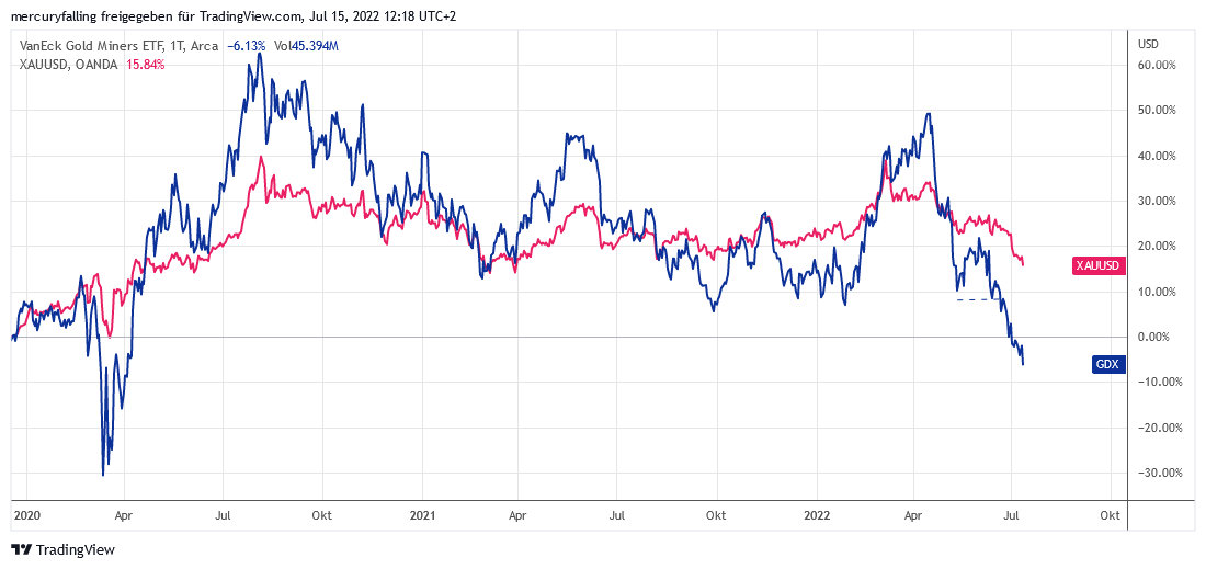 Sie leiden zum einen unter den fallenden Gold- und Silberpreisen, und dies aufgrund des impliziten Fremdkapitalhebels überproportional, wie ein Vergleich mit dem Goldpreis in Chart 1 zeigt.