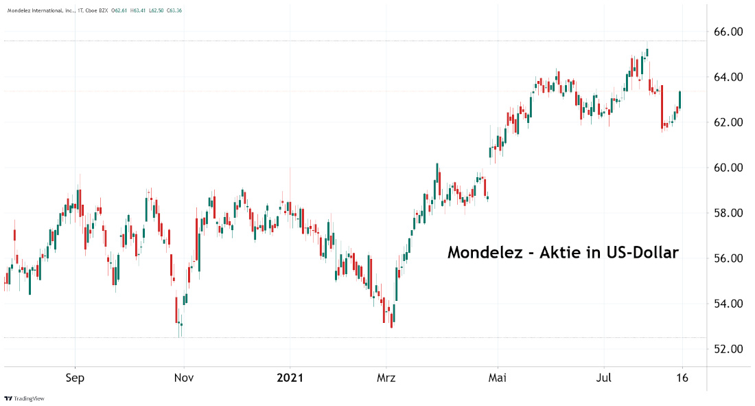 Aktuell wird der Titel mit einem geschätzten 2022er-KGV von 21 und einem 2023er-KGV von 20 gehandelt, womit der Anteilschein für einen gut aufgestellten Lebensmittelkonzern nicht zu teuer ist. Zudem winkt die Aktie mit einer geschätzten 2022er-Dividendenrendite von 2.3 %, wobei die Ausschüttungen darüber hinaus sukzessiv weiter steigen sollten. Gleichzeitig ist das Geschäftsmodell von Mondelez überaus konjunkturresistent, da selbst in Zeiten eines Konjunkturabschwungs viele Verbraucher ihr Konsumverhalten bei Alltagsprodukten kaum ändern, wohingegen bei kostspieligen Neuanschaffungen wie Autos weitaus schneller gespart wird. Daher bleibt der Titel eine überaus solide Halteposition.