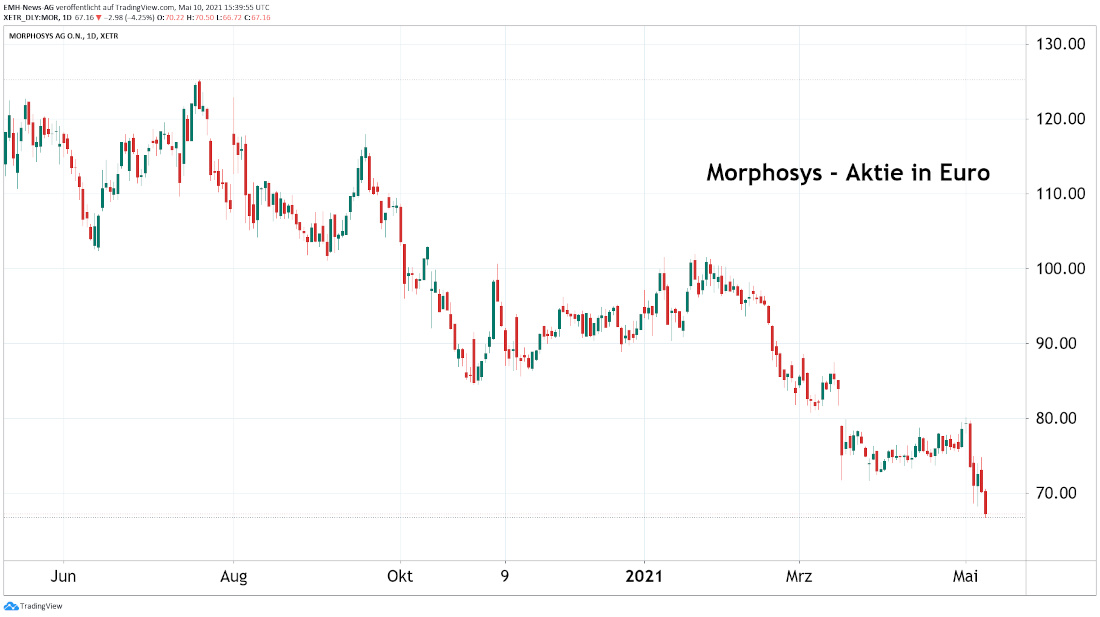 Noch vor wenigen Jahren kämpfte die Firma Morphosys (DE0006632003) gemeinsam mit dem Evotec-Konzern (DE0005664809) um den Titel des wertvollsten börsennotierten deutschen Biotechkonzerns. Diese Zeiten scheinen nach den erfolgreichen Börsengängen von BioNTech (US09075V1026) und CureVac (NL0015436031) aber mittlerweile endgültig der Vergangenheit anzugehören, da Morphosys bei der Marktkapitalisierung mit insgesamt 2,3 Milliarden Euro gegenüber den beiden Impfstoffentwicklern, die es momentan auf einen Börsenwert von rund 36 Milliarden Euro bzw. 15 Milliarden Euro bringen, nicht nur weit ins Hintertreffen geraten ist. Vielmehr vollzieht der Anteilschein von Morphosys gerade eine massive Abwärtsentwicklung, die sich nach der jüngsten Vorstellung des Q1-Berichtes sogar noch beschleunigte.