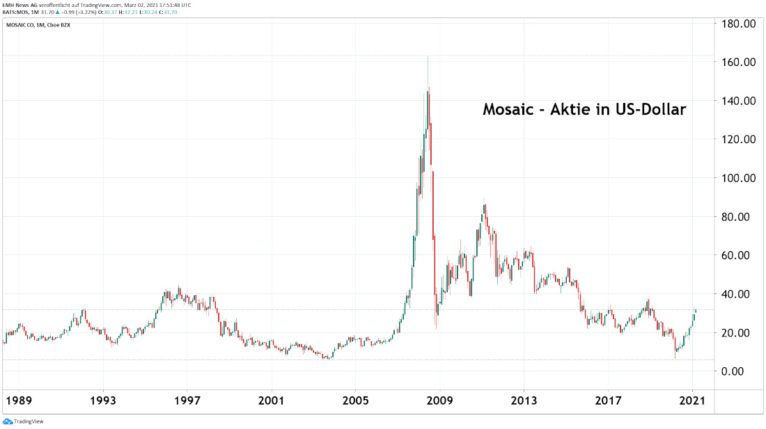 Auch mittelfristig bestehen dank des chinesischen Getreidehungers, der kältebedingten Ernteausfälle in den USA sowie der Unterbrechung von Lieferketten beste Aussichten auf steigende Notierungen bei den verschiedensten Grundnahrungsmitteln. Entsprechend erwarten Marktbeobachter, dass Mosaic von einer höheren Absatzmenge bei zugleich besseren Verkaufspreisen für seine Produkte profitieren kann. Einige Experten gehen sogar von einem lang anhaltenden Zyklus von steigenden Düngemittelpreisen aus, der zu einer regelrechten Gewinnexplosion bei dem US-Unternehmen führen könnte.