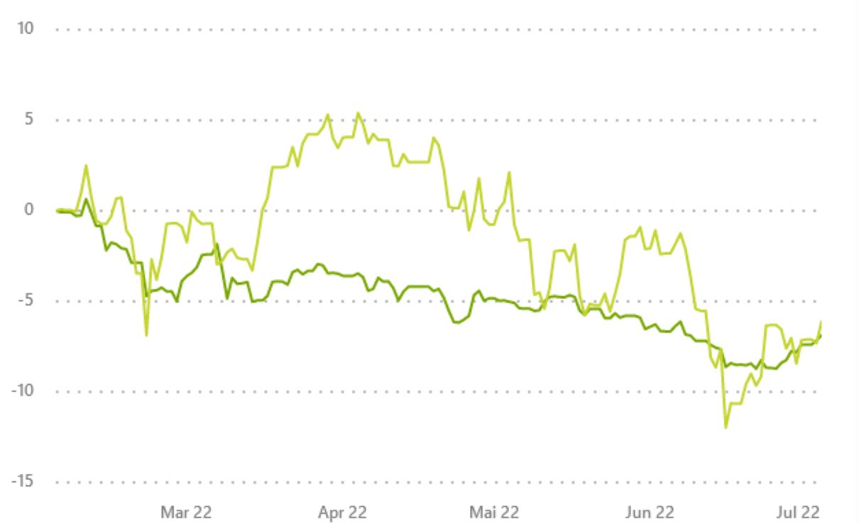 Chart: Wikifolio NTG24 AKTIEN KONSERVATIV (dunkelgrün) gegen MSCI WORLD (Euro)-Index (hellgrün)