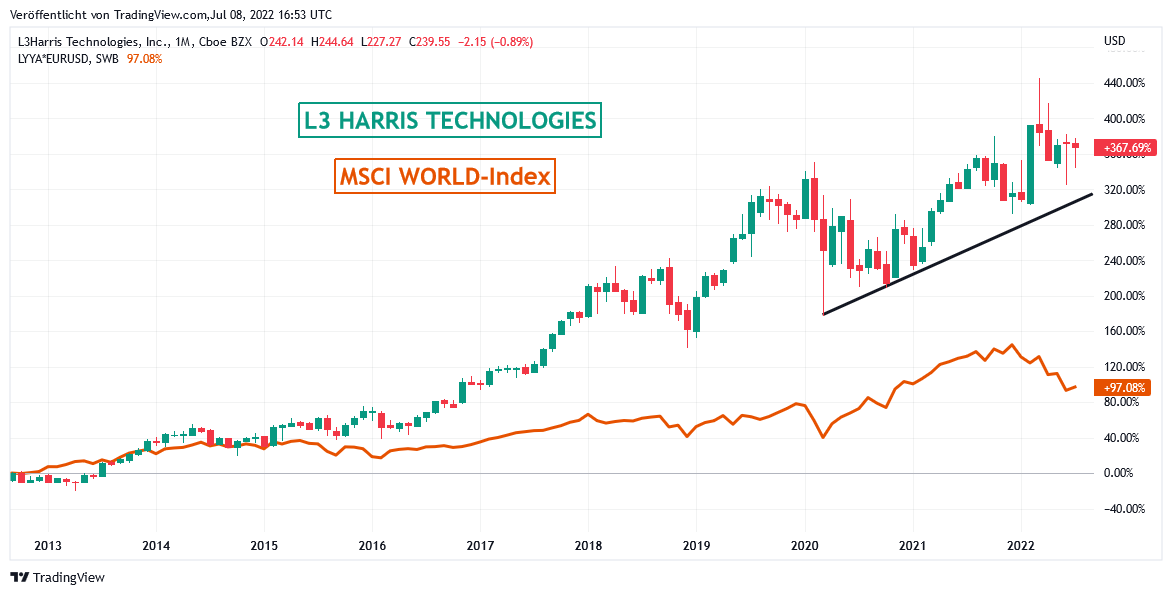 Im Fall der L3 HARRIS TECHNOLOGIES CORP., die mit operativem Hauptsitz im US-Bundesstaat Florida im Juni 2019 aus der Fusion von L3 TECHNOLOGIES (Gründung 1991) mit der HARRIS CORP. hervorging und bei der es sich bei einer stattlichen Aktienmarktkapitalisierung von rd. 46 Mrd. USD und rd. 47.000 Mitarbeitern weltweit (Konzernumsatzanteil USA jedoch weiterhin über 90 %) vor allem in der Luft-/Raum- und Schifffahrts-Industrie um einen der führenden Entwickler und Hersteller von zivilen wie auch militärischen Kommunikations-, Überwachungs-, Aufklärungs- und Sicherheitssystemen (incl. dem gesamten IT-technischen Spektrum von Abwehrlösungen gegen Cyber-Angriffe) handelt, beflügelte dagegen vor allem die am 30.06. erfolgte Vorstellung und Markteinführung der Erweiterung eines rd. 22.000 Meilen über dem Erdboden positionierten Weitwinkel-Geosatelliten durch Infrarot-Komponenten den Aktienkurs.