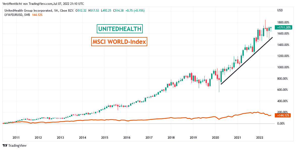 Bei der 1977 gegründeten UNITEDHEALTH, mit einer gigantischen Aktienmarktkapitalisierung von gegenwärtig 483 Mrd. USD derzeit weltweit der mit Abstand größte und damit äußerst wachstumsstetige Gesundheitsdienstleister (allerdings mit Aktivitäten fast ausschließlich nur in den USA) im breit gefächerten Preis- und Leistungsvergleichs-Angebot von Plattformen der Segmente allgemeiner Krankenversicherungen, staatlicher Gesundheits-Zusatzleistungen (in den USA sog. Medicare- und Medicaid-Pläne), präventiver und konservierender Kur- oder auch Heilpraktiker-Ergänzungsleistungen, der Optimierung von Pharma-Kostenbudgets für Endverbraucher wie auch einkaufende Krankenhäuser, Arztpraxen und Apotheken, dem Angebot medizinischer Haus- oder Gemeinde-Versorgungsdienstleistungen oder auch der Organisations- und Budgetoptimierung unternehmensinterner Gesundheitseinrichtungen lagen dem deutlichen Aktienkursanstieg der letzten Woche keine grundlegend neuen fundamentalen Unternehmensnachrichten oder auch weitere Heraufstufungen durch Analysten zugrunde.