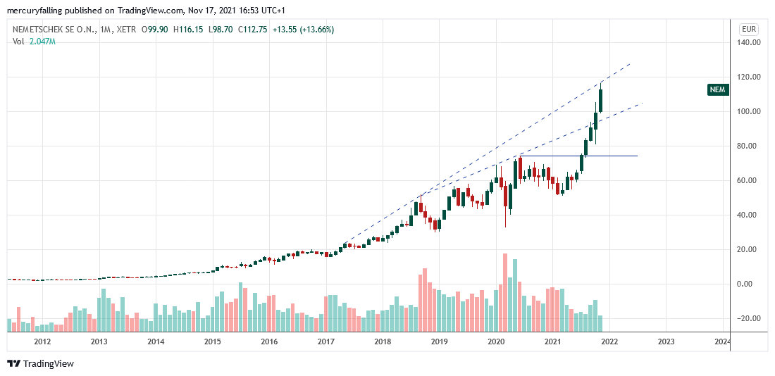 Nachdem die Aktie Ende 2020 noch bei 60,40 Euro gehandelt wurde, steht sie inzwischen bei 112,75 Euro und ist mit einem KGV für 2022 von 93,4 sportlich bewertet, wenngleich darin eine berechtigte Wachstumsprämie enthalten ist, auf deren Rückgang man vor dem Hintergrund der glänzenden Aussichten nicht hoffen sollte.