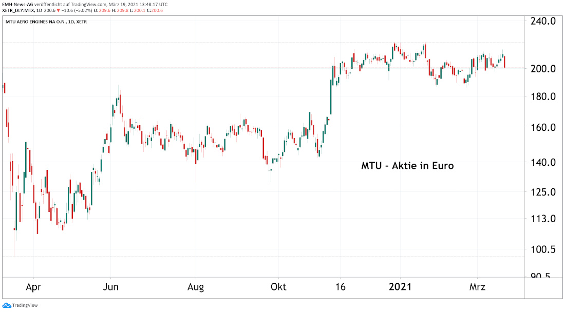 Seit Mitte November 2020 pendelt die MTU-Aktie (ISIN: DE000A0D9PT0; WKN: A0D9PT) in einer relativ engen Handelsspanne, welche durch die Marken von 185 Euro und 220 Euro begrenzt wird. Damit vollzieht der Anteilschein des Triebwerkbauers seit mittlerweile gut vier Monaten eine ausgeprägte Konsolidierungsbewegung, nachdem er dank der damals aufkommenden Impfstoffeuphorie eine massive Erholungsbewegung erzielen konnte. Auf diesen Seitwärtstrend hatten auch bislang die jüngsten Debatten über neue Covid-19-Beschränkungen in vielen europäischen Ländern ebenfalls keinen wesentlichen Einfluss. Auch wenn in den kommenden Wochen der Corona-Pessimismus die Stimmung bei unserem Wert aus dem spekulativen Musterdepot etwas dämpfen könnte, so halten wir unverändert an unserem bislang überaus erfolgreichen Investment fest.