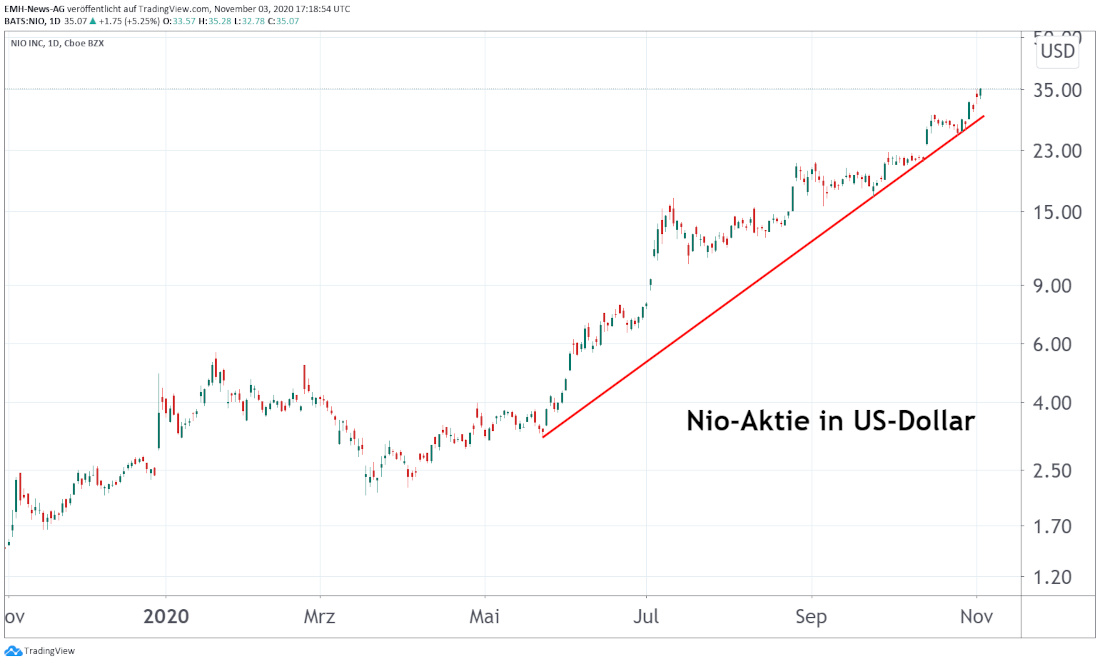 In den vergangenen Tagen litten die internationalen Aktienmärkte unter einem überdurchschnittlich starken Abgabedruck. Umso beeindruckender ist der jüngste Kursanstieg der NIO-Aktie (ISIN: US62914V1061; WKN: A2N4PB), die erst gestern an der Wall Street im Tagesverlauf um nochmals rund 9 % in die Höhe schnellte und somit ein neues Allzeithoch markierte.