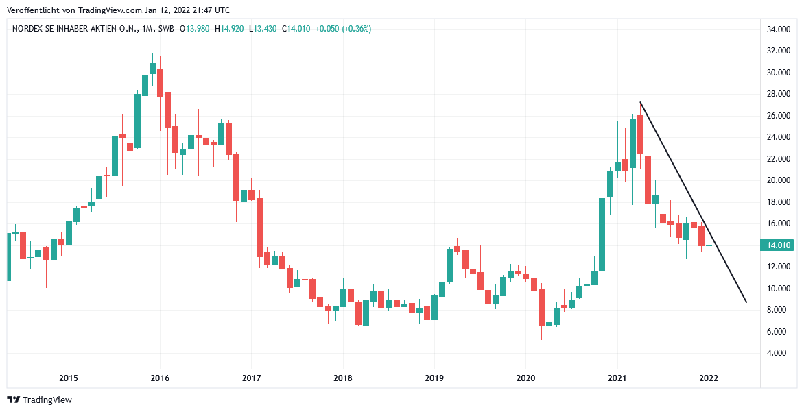 Nach der heutigen Meldung eines weiteren Auftrags der spanischen RWE-Division „Renewables“ Iberia zur Konstruktion von 9 Windpark-Turbinen für das im Neuaufbau befindliche Projekt „Rea Unificado“ in der spanischen Region Kastilien & Leon befestigte sich die Aktie der des international führenden Windkraftanlagenherstellers NORDEX zunächst nur kurzzeitig auf bis zu 14,50 EUR, bevor sie den Handel im Tradegate-Schluss letztlich doch mit einem Minus von – 0,8 % bei 14,10 EUR abschloss. Der zurückliegende steile Aktienkorrekturtrend seit Anfang April 2021 ist damit trotz der im November 2021 eingeleiteten, mühsamen Stabilisierungsversuche auch weiterhin als gänzlich intakt anzusehen.