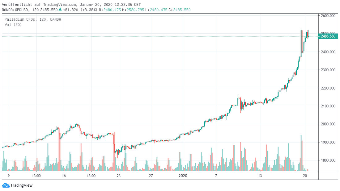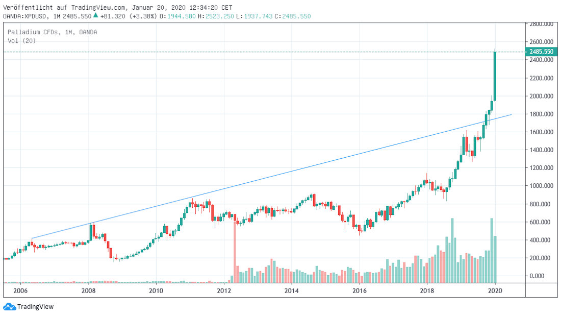 Ein Merkmal dieser physischen Knappheit sind die Terminkurse von Palladium. Ein Blick auf die Preisübersicht der bezahlten Palladium-Future-Kurse an der Globex zeigt dies deutlich. Der Terminkontrakt auf Palladium mit Verfallstermin März 2020 wurde zuletzt mit 2.283,90 Dollar bezahlt, jener mit Verfallstermin Juni 2020 mit 2273 Dollar, und jener mit Verfallstermin September 2020 mit 2250 Dollar. Damit besitzt Palladium zwischen März und September 2020 für diese 6 Monate Differenz eine Laufzeitenprämie von 33,90 Dollar. Diese Prämie ist ein Future-Käufer dafür bereit zu zahlen, dass er Palladium 6 Monate eher als September 2020 erhält.