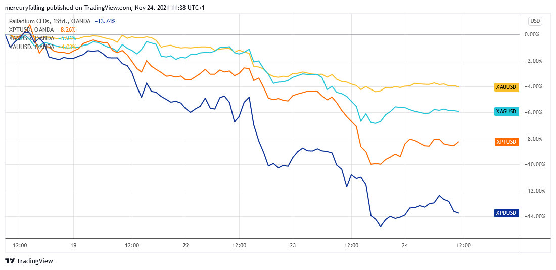 Palladium hat im Vergleich zu Gold, Silber und auch dem Schwestermetall Platin in den vergangenen Tagen dabei deutlich stärker nachgegeben, wie Chart 1 verdeutlicht.
