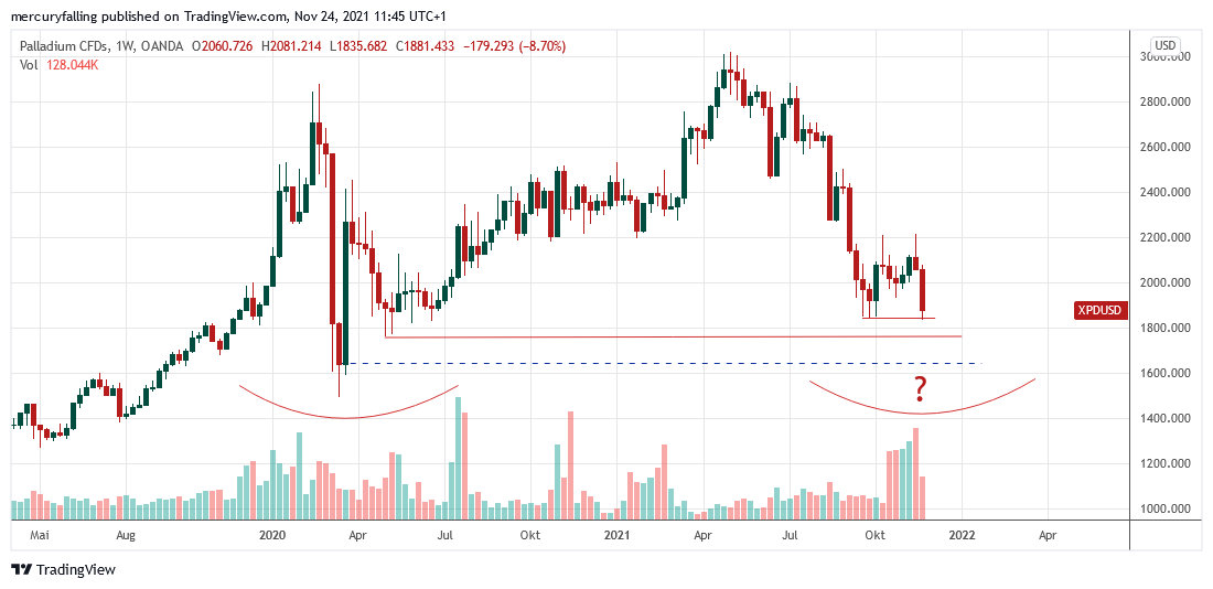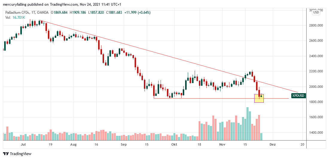 Zwar steht eine Bestätigung auf Monatscandle-Basis in der kommenden Woche noch aus, gleichwohl muss der Ausbruchsversuch über die mittelfristige Abwärtstrend-Linie in Chart 2 als gescheitert gelten. Nachdem diese mittelfristige Abwärtstrend-Linie im November wieder unterschritten wurde, hat Palladium in dieser Woche nun gestern auch die Unterstützung vom 29.09.2021 bei 1.846 Dollar intraday mit einem Tagestief von 1.835,68 Dollar unterschritten.