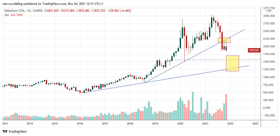 Hinzu kam aber auch, dass die anhaltenden Versorgungsprobleme in der Chipproduktion insbesondere den Automobilsektor trifft, was sich seit den Sommermonaten in sinkenden Verkaufszahlen widerspiegelt und damit auch die Palladium-Nachfrage deutlich belastet. Palladium wird vor allem zur Reduzierung von Emissionen in Auto-Katalysatoren eingesetzt.