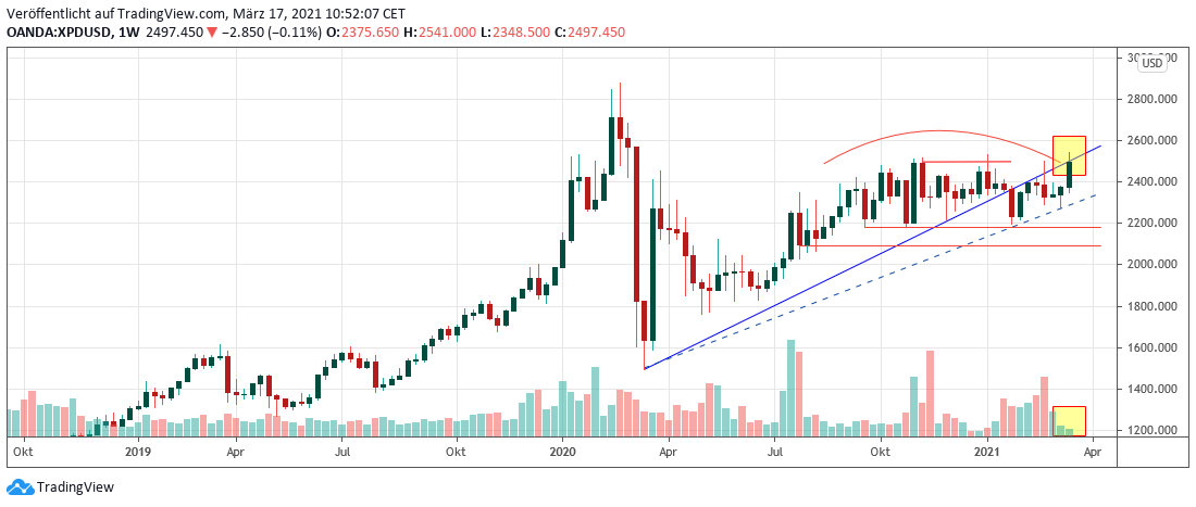 Für den Palladiumpreis hat sich die charttechnische Lage nun zwar noch nicht auf Wochenschlusskurs-Basis geändert, jedoch auf Tagesbasis. Man darf also auf den Wochenschlusskurs von Palladium gespannt sein.