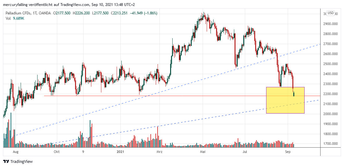 Der Preis für Palladium ist heute auf den tiefsten Stand seit 11 Monaten gefallen, das Tagestief lag bisher bei 2.177,50 Dollar.