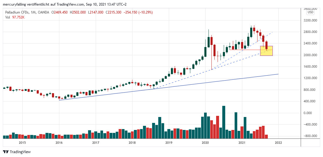 Zudem zeigt Chart 2, dass Palladium in Schüben von seinem Allzeithoch im Mai 2021 abgesackt ist. Der erste kam Mitte Juni und der zweite Mitte August 2021. Letzterer führte auch zum Bruch der seit dem Corona-Crash im März 2020 laufenden mittelfristigen Aufwärtstrend-Linie. Dies beschleunigte die darauffolgende Abwärtsbewegung, die im charttechnischen Niemandsland kurz zum Stehen kam, bevor sie in der gestrigen Abwärtsbewegung ihre Fortsetzung fand.
