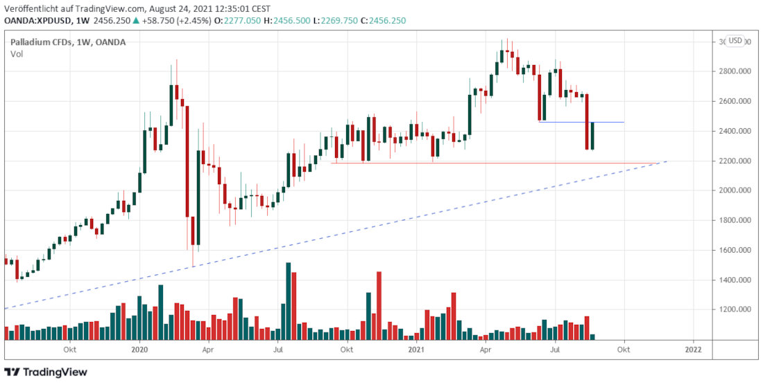 Allerdings wirken auf den Palladiumpreis auch kurzfristige Faktoren, welche zudem nicht friktionslos eingepreist werden, wie der Einbruch von Palladium ab dem 16.08.2021 in Erinnerung ruft.