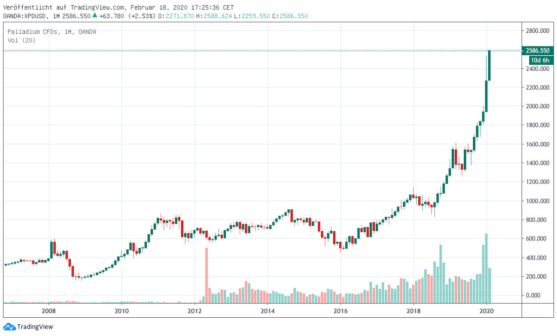 Ein Blick auf den langfristigen Kursverlauf zeigt das Dilemma einer ,,Fahnenstange‘‘. Denn eine solche liegt bei Palladium inzwischen vor. Da diese Entwicklung auf einer physischen Knappheit des Metalls beruht, ist eine Spekulation gegen diesen Trend aus Sicht von Short-Spekulanten sehr riskant.