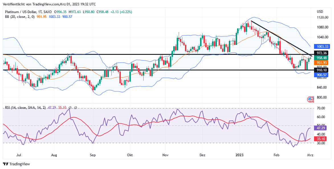 So gelang Platin (TVC:PLATINUM) bis unmittelbar vor diesem Publikationstermin um 16:00 Uhr in offenbar erneut vor allem rein spekulativen US-Trading-Investments in der Hoffnung auf einen günstigeren Ausgang dieser ISM-Indexveröffentlichung zwar noch der Sprung auf ein Tageshoch von fast 973 USD, der nach Überwindung des vorherigen Widerstands von 965 USD anschließend nun den signifikantesten Langfrist-Horizontal-Widerstand im Wochenchart bereits seit Juni 2022 darstellt.