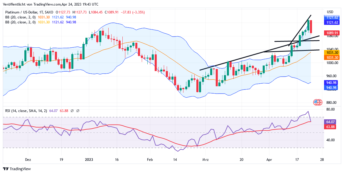 NTG24-Tagesbericht Platin vom 24.04.2023: Platin zollt seiner seit 10 Tagen bestehenden Rallye-Übertreibung heute technisch starken Tribut