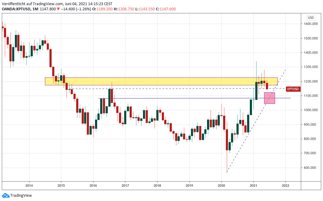 Der Platinpreis befindet sich aktuell im Korrektur-Modus und konsolidiert dabei seinen Ausbruch aus seinem langfristigen Abwärtstrend im November 2020. Im Zuge dessen ist nun auch ein Test der Kreuzunterstützung auf Monatscandle-Basis bei 1.078 Dollar möglich. Sowohl das laufende Korrekturmuster wie auch die Umsatzentwicklung deuten aber stark darauf hin, dass es sich auch bei einer Korrektur darunter um eine Korrektur in einem neuen Aufwärtstrend und nicht um eine Trendumkehr nach unten handelt.