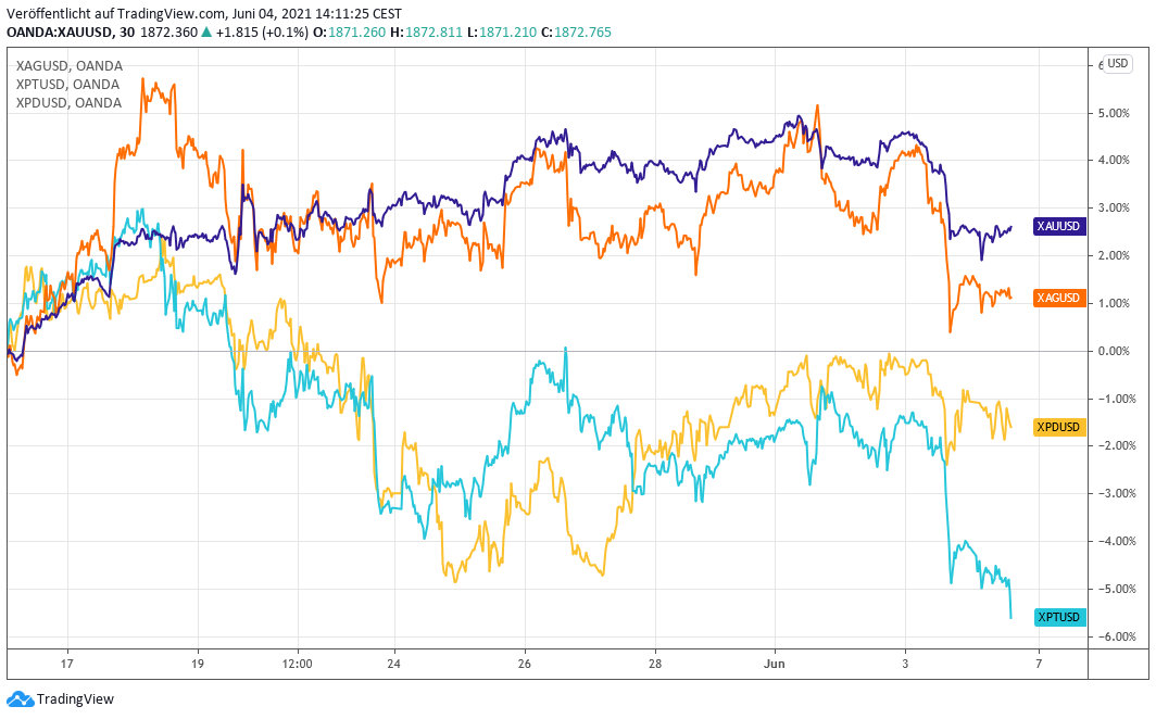 Parallel dazu spiegelt sich in der Entwicklung von Palladium die Konsolidierung des Ausbruches auf ein neues Allzeithoch wider. Stellt man nun den Platinpreis dagegen, so wird deutlich, dass die Abwärtsdynamik am stärksten ausgeprägt ist.