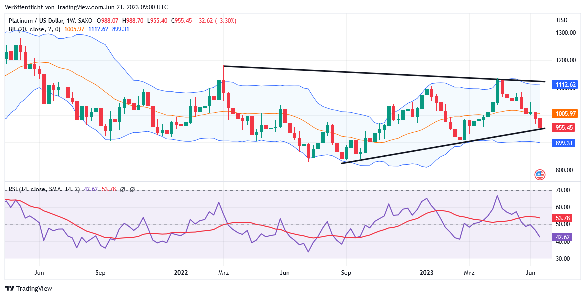 Würden diese vom Gesamtmarkt schon bislang seit 14.06. verständlicherweise klar negativ aufgenommenen Leitzinsankündigungen der FED daher heute von Powell, Cook und Jefferson im Rahmen ihrer Kongressanhörungen noch einmal zumindest sinngemäß unverändert bestätigt werden, wäre aus unserer Sicht heute ab 16 Uhr (und dies ggfs. auch für die Folgetage) mit einer deutlichen weiteren Sentiment-Verschlechterung gegenüber allen Edelmetallen zu rechnen, die für Platin im Fall seiner klaren Unterschreitung von 950 USD dann charttechnisch sehr leicht den definitiven Bruch seines seit Ende August 2022 etablierten Grund-Aufwärtstrends nach sich ziehen könnte.