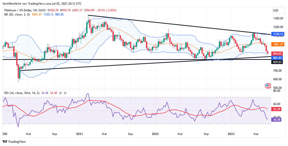 Am Freitag befestigte sich Platin ab 14:30 Uhr nach einer erneut vorangegangen Verkaufswelle letztlich doch noch um + 0,8 % auf 906 USD, nachdem die vorgestern neu publizierten US-Wirtschaftsdaten insgesamt das recht erfreuliche Bild eines weiter nachlassenden Preissteigerungsdrucks bei dennoch im Juni gleichzeitig weiterhin gegebenen Signalen einer soliden US-Wirtschaftsdynamik zeichneten.