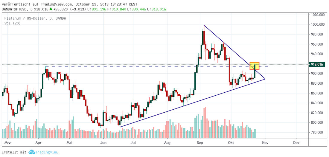 Denn wie der zweite Chartverlauf zeigt, überschritt der Platinpreis intraday auch wieder das Zwischenhoch vom April 2019. Ein Wochenschlusskurs darüber wäre ein weiteres Anzeichen dafür, dass die Korrektur auch auf höherer Skale dem Ende zugeht.