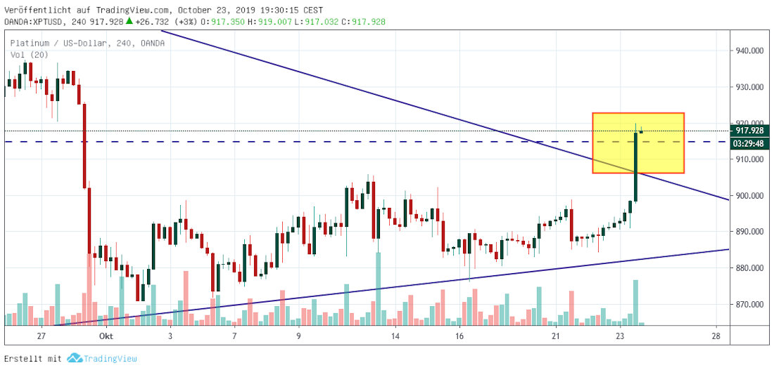 Mehr oder weniger aus dem Nichts ging es heute mit Platin deutlich aufwärts. Ein Blick auf den Stundenchart zeigt, dass der Platinpreis mit guten Umsätzen aus seinem Konsolidierungskeil auf kleiner Skale ausgebrochen ist. Damit ist zwar die Korrektur noch nicht vorüber. Gleichwohl erhöhen sich damit die Chancen, dass Platin sein Korrekturtief gesehen hat.