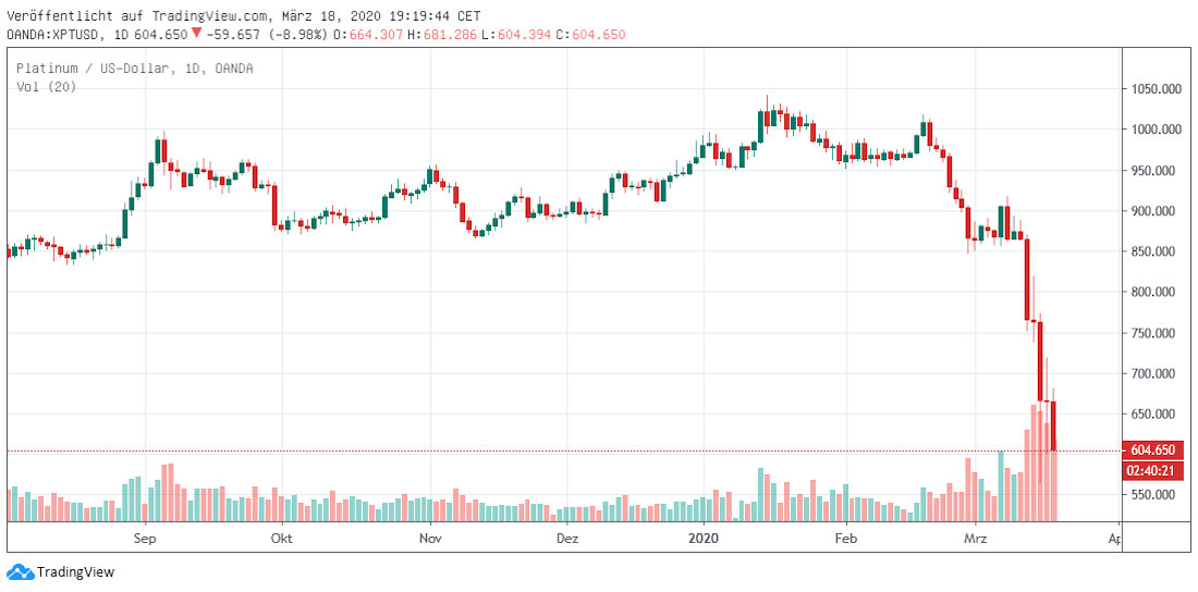 Den März 2020 werden wohl auch Platininvestoren so schnell nicht vergessen. Denn es ging regelrecht eine Falltür an den Börsen auf und der Platinpreis fiel hinein. Dabei kam es mit dem Unterschreiten wichtiger Unterstützungen zu einer Beschleunigung des Absturzes.
