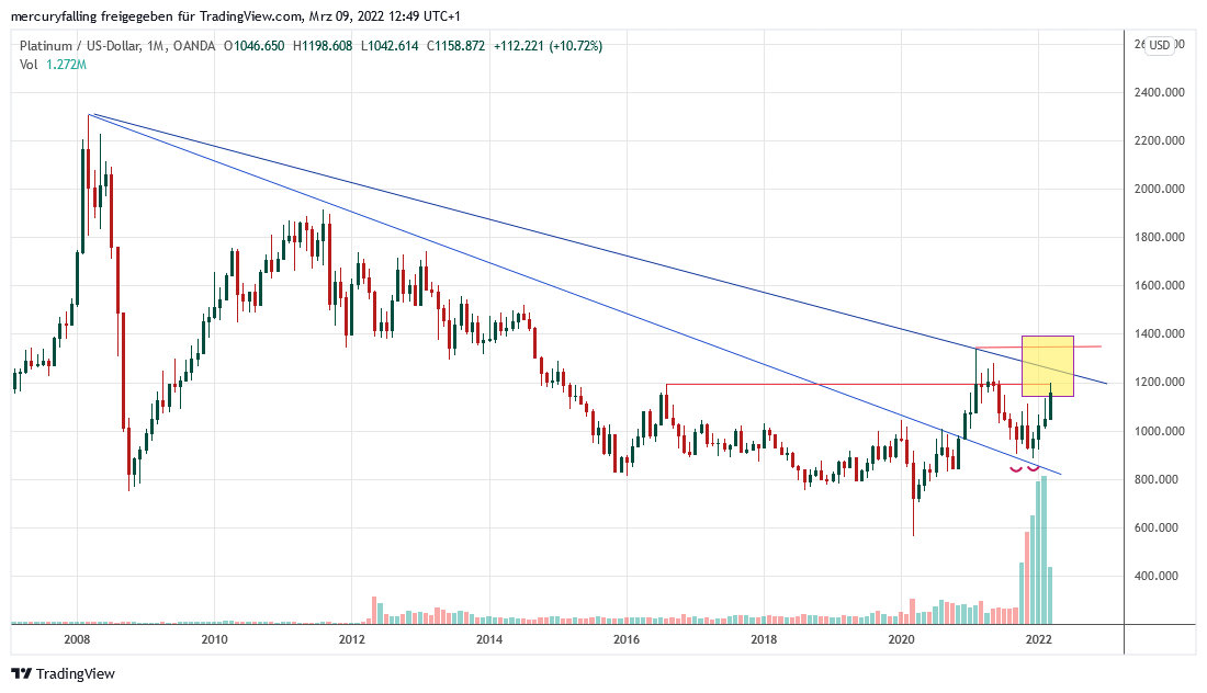 Wie plausibel ist dieses Szenario bei einem Platinpreis, der seinen Korrekturboden gebildet haben und seine bereits überwundene langfristige Abwärtstrend-Linie erfolgreich getestet haben könnte? Wie plausibel ist die ETF-Prognose des WPIC für 2022 angesichts der massiven Umsatzsteigerung bei Platin in den vergangenen Wochen? Die charttechnische Ausgangslage zeigt folgender langfristiger Kurschart.