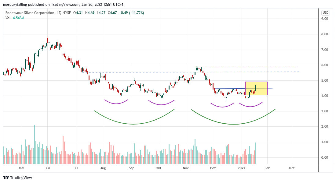 Vor diesem Hintergrund bauen wir unser Exposure im Silberminen-Bereich weiter aus und kaufen heute eine Anfangsposition in Endeavour Silver zurück. Wir waren in der Aktie im April 2021 ausgestoppt worden. Seither hat die Aktie, wie ein Blick auf den Chart zeigt, in hoher Ähnlichkeit zum Konsolidierungsmuster bei Silber einen doppelten Doppelboden gebildet. Über die Nackenlinie des zweiten kleineren Doppelbodens (blaue Linie) ist es gestern mit sehr hohen Umsätzen nach oben ausgebrochen. Damit hat sich die charttechnische Situation der Aktie deutlich verbessert.