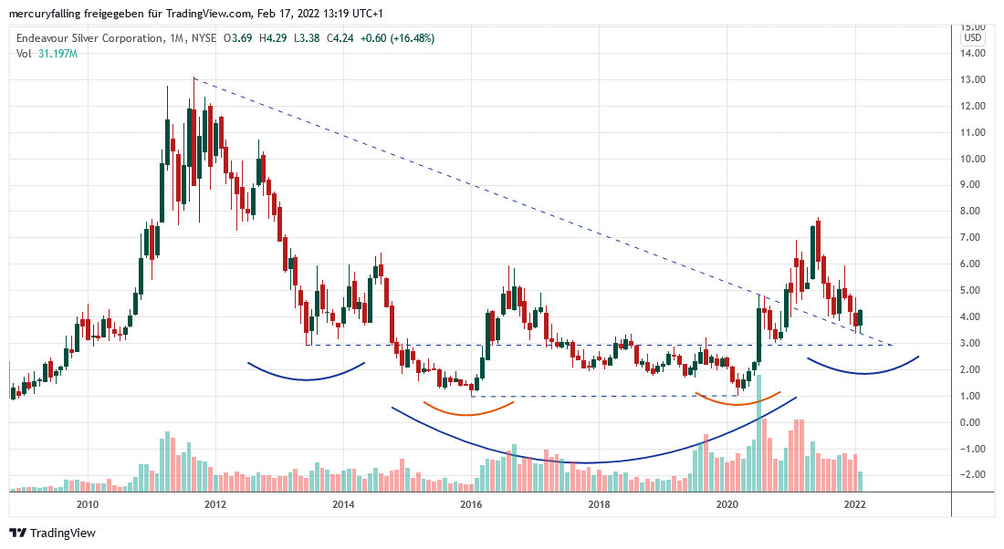 Musterseitig steht aber auch die Bodenbildung des Silberpreises jener von Gold kaum nach. Silber hat im Zuge seiner seit August 2020 laufenden Konsolidierung des vorangegangenen Ausbruchs einen fraktalen Doppelboden gebildet. Diesen haben verschiedene Silberminen-Aktien im Wesentlichen nachvollzogen, zu denen auch die Aktie von Endeavour Silver. Wir hatten eine Anfangsposition in der Aktie bereits am 20.01.2022 zurückgekauft.