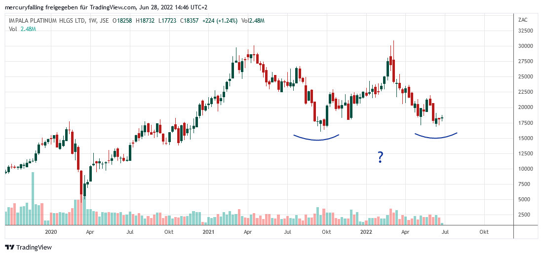 Die Edelmetalle befinden sich weiter in der Konsolidierung, und auch die Edelmetall-Minenaktien warten noch auf eindeutige Signale für die Beendigung der scharfen, seit Mitte April 2022 laufenden Korrektur. Zu den Aktien, welche bereits realistische Aussichten haben, auf dem aktuellen Kursniveau einen mustertechnisch signifikanten Boden zu bilden, gehört auch Impala Platinum. Wir stocken deshalb unsere bestehende Anfangsposition in dem Titel heute zum Eröffnungskurs an der Börse Johannesburg um eine halbe (ca. 3,75 % des Depotvolumens) auf eine volle Position auf.