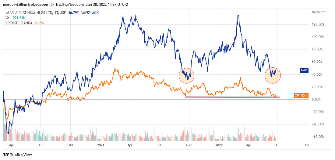 Neben der charttechnischen Musterlage von Impala spricht auch ein Vergleich mit der Entwicklung des Platinpreises (in Chart 2) für eine Bodenbildung in der Nähe des aktuellen Kursniveaus.