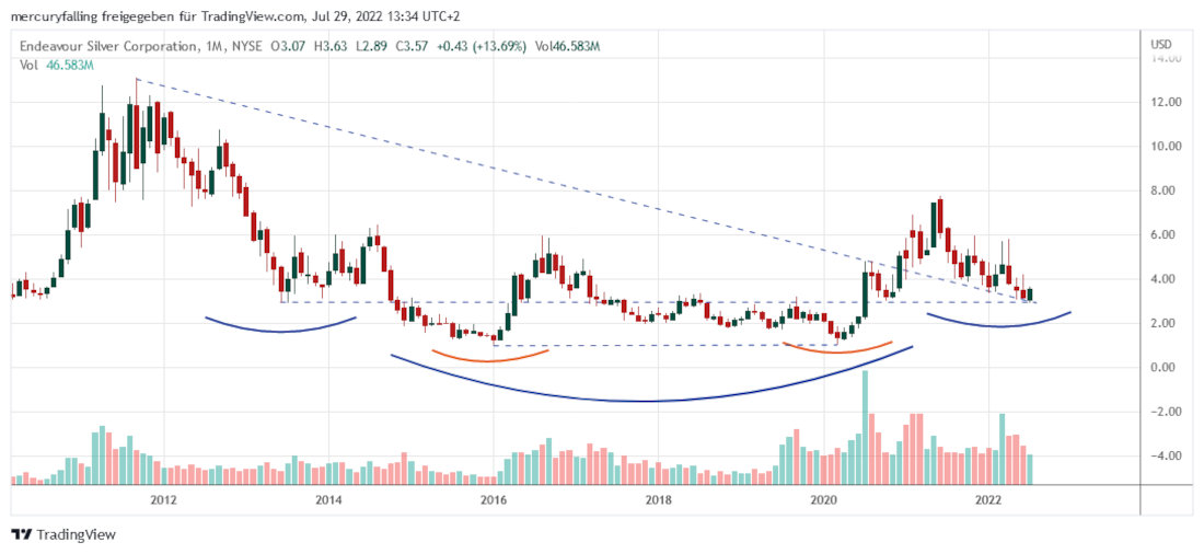 Betrachtet man jedoch die einzelnen Chancen-Risiko-Profile, so schälen sich jene Aktien heraus, die entweder operativ oder aus technischer Sicht eine relative Stärke zeigen. Diese Werte sind für uns bevorzugte Titel für die ersten Rückkäufe ins Themendepot Edelmetalle. Zu den Werten, die sowohl technisch als auch von seinen operativen Produktionszahlen her besser abschneiden als der Gesamtmarkt, gehört auch unser Depotwert Endeavour Silver (CA29258Y1034). Besonders interessant ist ein dabei ein Blick auf die langfristige Einordnung der jüngsten Kursrückgänge in nachstehender Grafik.