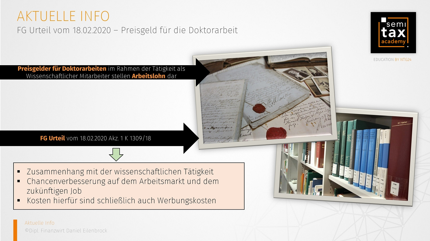 Stellen Sie sich vor, Sie erhalten für Ihre Doktorarbeit / Dissertation ein Preisgeld. Sie würden sich natürlich freuen, doch was ist mit dem Finanzamt? Ist dieses Preisgeld dann in der Einkommensteuererklärung einzutragen? Das Finanzgericht Köln hat in einem Fall hierzu Stellung bezogen.
