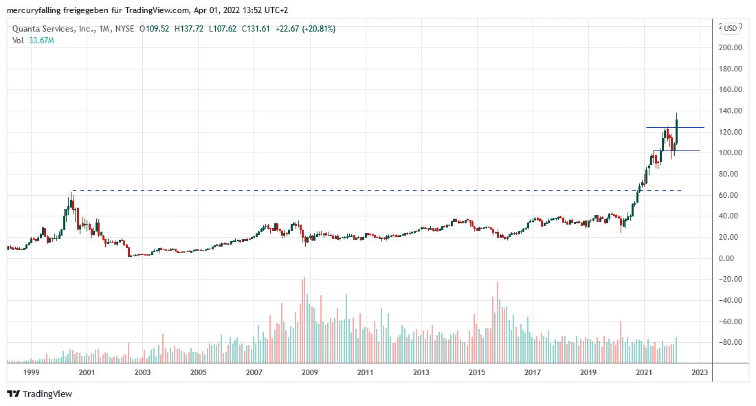 Das US-Service-Unternehmen Quanta Services hat ein erfolgreiches Geschäftsjahr 2021 hinter sich und dürfte die hohe Geschäftsdynamik auch im laufenden Jahr aufrechterhalten. Dabei profitiert der Konzern insbesondere von der ,,grünen Transformation‘‘ der US-Volkswirtschaft. Die Aktie von Quanta hat Mitte März 2022 seine Konsolidierung beendet und ein neues Kaufsignal gegeben. Die Aktie bleibt aussichtsreich.