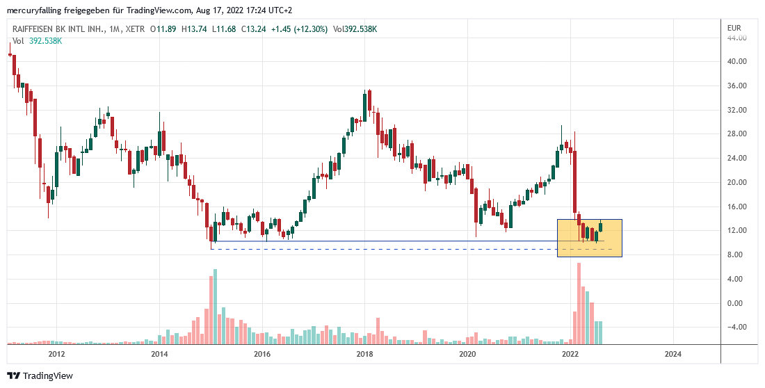 Dies belebte auch die Aktie von Raiffeisen. Zuvor war diese im Ausverkauf auf Monatsschlusskurs-Basis bis auf die wichtige Unterstützung bei 10,27 Euro gefallen. Der Unterschied lag dabei nur bei einem Euro-Cent, denn der Monatsbeginn vom Februar 2015 lag bei 10,27 Euro, der Monatsbeginn vom Juli 2022 dagegen bei 10,28 Euro!