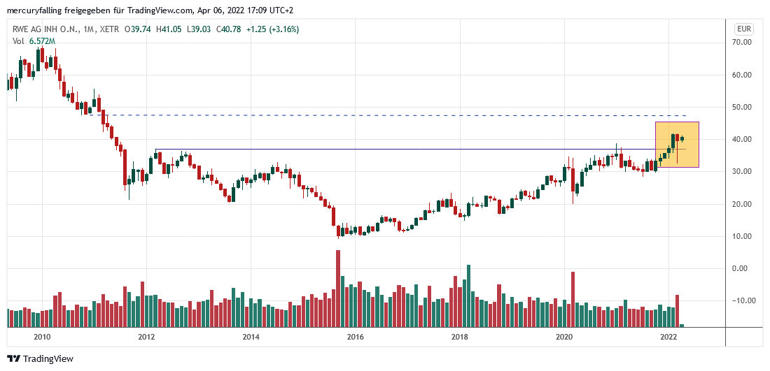 Der deutsche Energiekonzern RWE steht derzeit mitten in den Marktturbulenzen, welche zuerst die Corona-Pandemie und danach der Einmarsch Russlands in die Ukraine auf dem europäischen Energiemarkt ausgelöst hat. Das Unternehmen bezieht dabei aber relativ wenig Rohstoffe aus Russland und profitiert von einer beschleunigten Hinwendung zu erneuerbaren Energiequellen. Seit Februar 2022 hat die Aktie deutliche charttechnische Signale gegeben, die mittelfristig deutlich höhere Kurse erwarten lassen. Der Titel bleibt damit aussichtsreich.