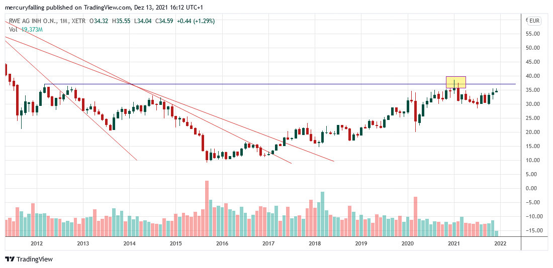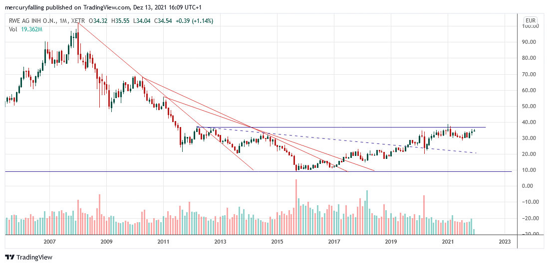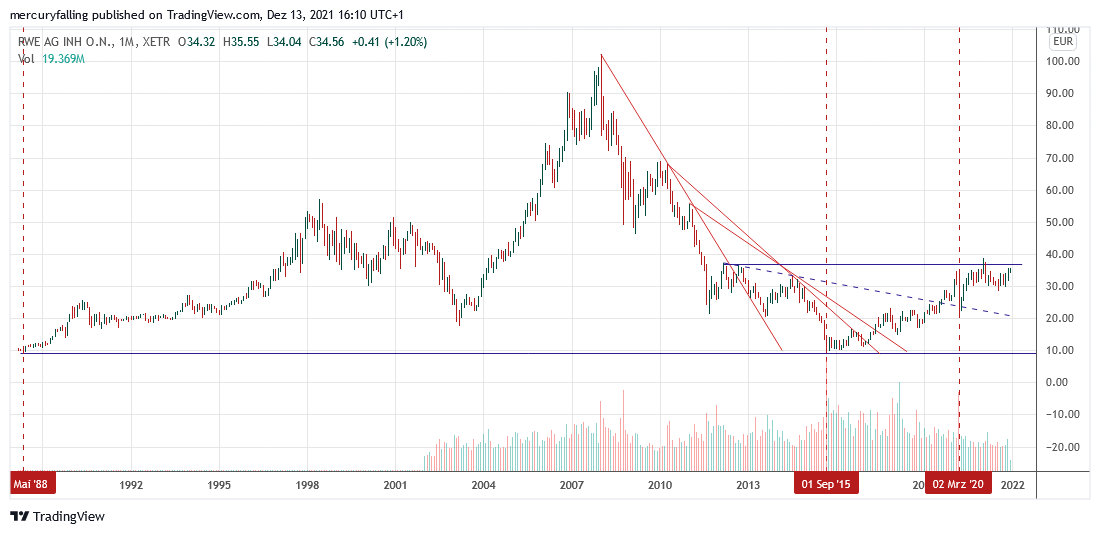 Ein Blick auf die langfristige Entwicklung der Aktie von RWE zeigt dabei den Abbruch der deutlich positiven Entwicklung bis zur Finanzkrise 2008/2009, an die sich der Atomausstieg ab 2011 anschloss. Dabei testete die Aktie im September 2015 mit einem Monatstief von 9,13 Euro das Allzeittief vom Mai 1988 bei 8,92 Euro, unterschritt es aber nicht.