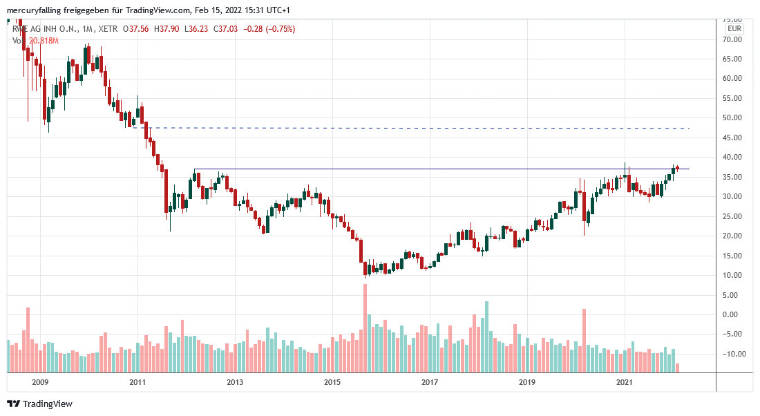 Die Aktie von RWE hat sein Zyklustief bereits im September 2015 erreicht und ging im Anschluss an einen stabilen Aufwärtstrend über, der nur durch den Corona-Crash im März 2020 kurz unterbrochen wurde. Bei einem ersten Versuch, die Widerstandszone bei 37,12 Euro zu überwinden, fehlte im Januar 2021 noch die Kraft.