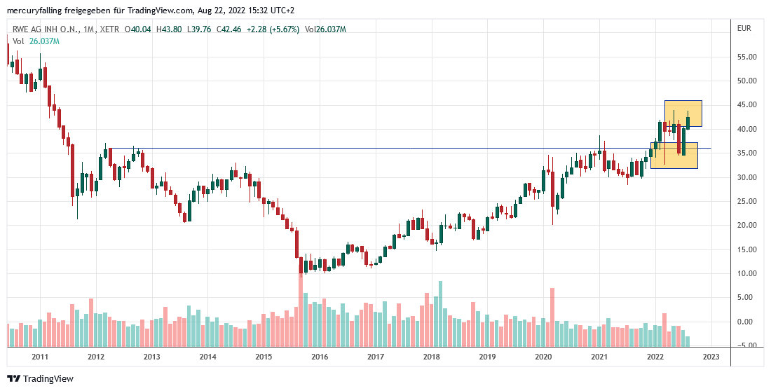 Diese belegen unter anderem, dass RWE mit seinen hohen Kapazitäten an erneuerbaren Energien über einen ,,Sweet Spot‘‘ in Zeiten explodierender Rohstoffpreise verfügt. Denn dadurch ist der ,,grüne‘‘ Teil der Stromerzeugung kaum vom explodierenden Preis fossiler Brennstoffe abhängig. Insbesondere der Offshore-Windbereich ist stark, und der Schwerpunkt Wasserstoff verleiht zusätzliche Wachstumsfantasie. Gleichzeitig profitiert das Unternehmen aber massiv von den gestiegenen Strompreisen. Sogar so stark, dass man auf die Ansprüche aus der Gasumlage verzichten konnte.
